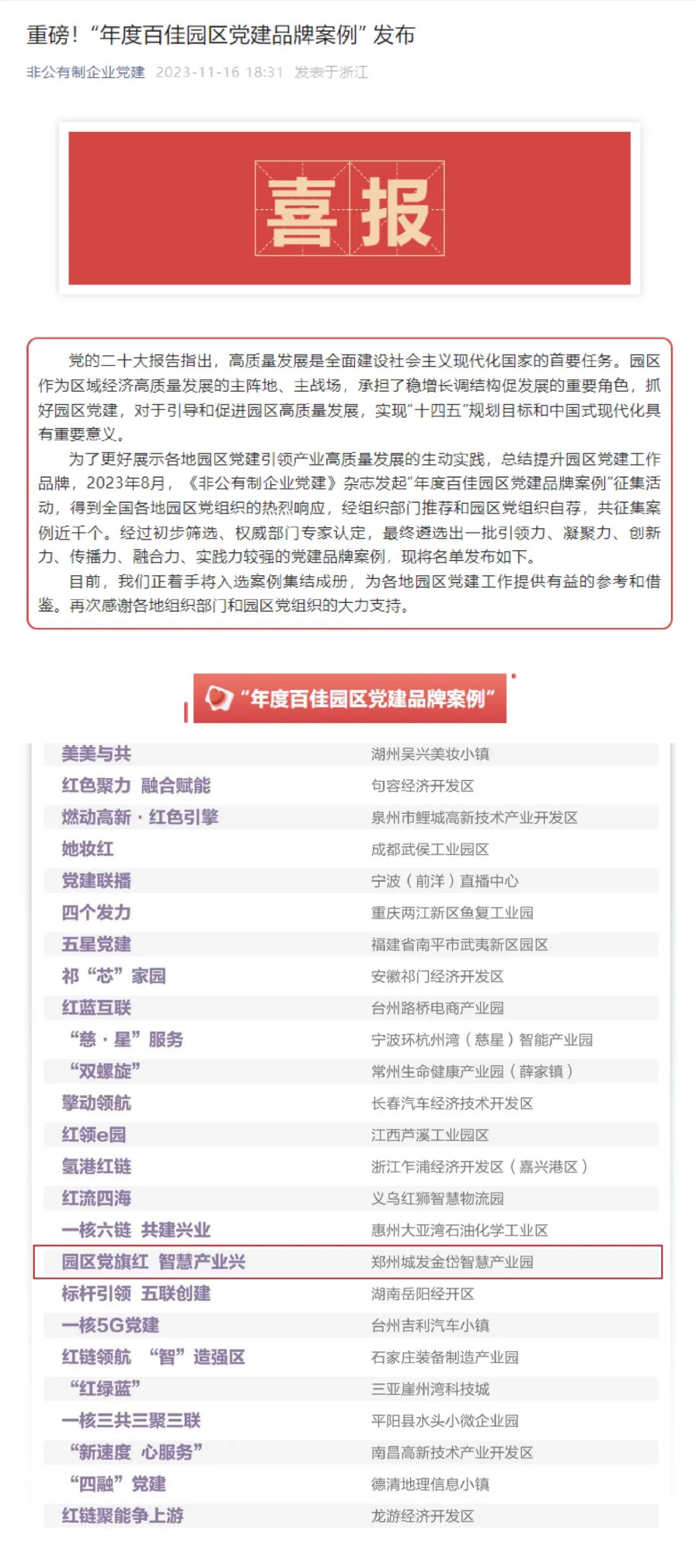 11月16日,由《非公有制企業(yè)黨建》雜志發(fā)起的“年度百佳園區黨建品牌案例”征集活動(dòng)遴選結果揭曉。鄭州城發(fā)集團“園區黨旗紅 智慧產(chǎn)業(yè)興”基層黨建“書(shū)記項目”從近千個(gè)入圍案例中脫穎而出,成功入選“年度百佳園區黨建品牌案例”。