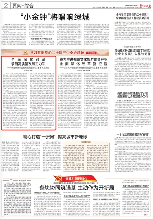 “黨的二十屆三中全會(huì )把深化國企改革納入進(jìn)一步全面深化改革戰略、推進(jìn)中國式現代化全局,為國有企業(yè)在新征程上改革轉型指明了前進(jìn)方向,明確了工作重點(diǎn)。”鄭州城市發(fā)展集團有限公司黨委書(shū)記、董事長(cháng)萬(wàn)永生表示,城發(fā)集團將以習近平總書(shū)記關(guān)于全面深化改革的一系列新思想、新觀(guān)點(diǎn)、新論斷和全會(huì )精神為指導,通過(guò)戰略性重組和專(zhuān)業(yè)化整合,苦練“內功”,筑強“筋骨”,爭當中國式現代化建設鄭州實(shí)踐的主力軍。