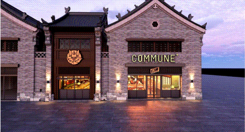 以COMMUNE幻師的門(mén)店設計為例——從效果圖可以看出,建筑外部以青灰色磚墻復刻商代建筑肌理,檐角神獸造型融入現代燈光設計,整體風(fēng)格充滿(mǎn)著(zhù)古樸與時(shí)尚。店內則以暖色調營(yíng)造松弛感,酒墻擺滿(mǎn)了來(lái)自全球的精釀。每當味蕾觸碰到精釀的麥香,窗外同時(shí)飄入來(lái)自3600年前夯土的氣息——在這里,顧客喝的不是單純的酒,而是歷史與現代的奇妙敘事。
