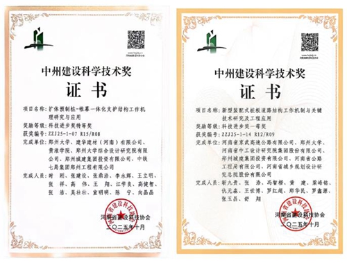 鄭州城建集團的“擴體預制樁—帷幕一體化支護結構工作機理研究與應用”與“新型裝配式樁板道路結構工作機制與關(guān)鍵技術(shù)研究及工程應用”兩項科研項目,分獲河南省“中州建設科學(xué)技術(shù)獎”特等獎和一等獎。