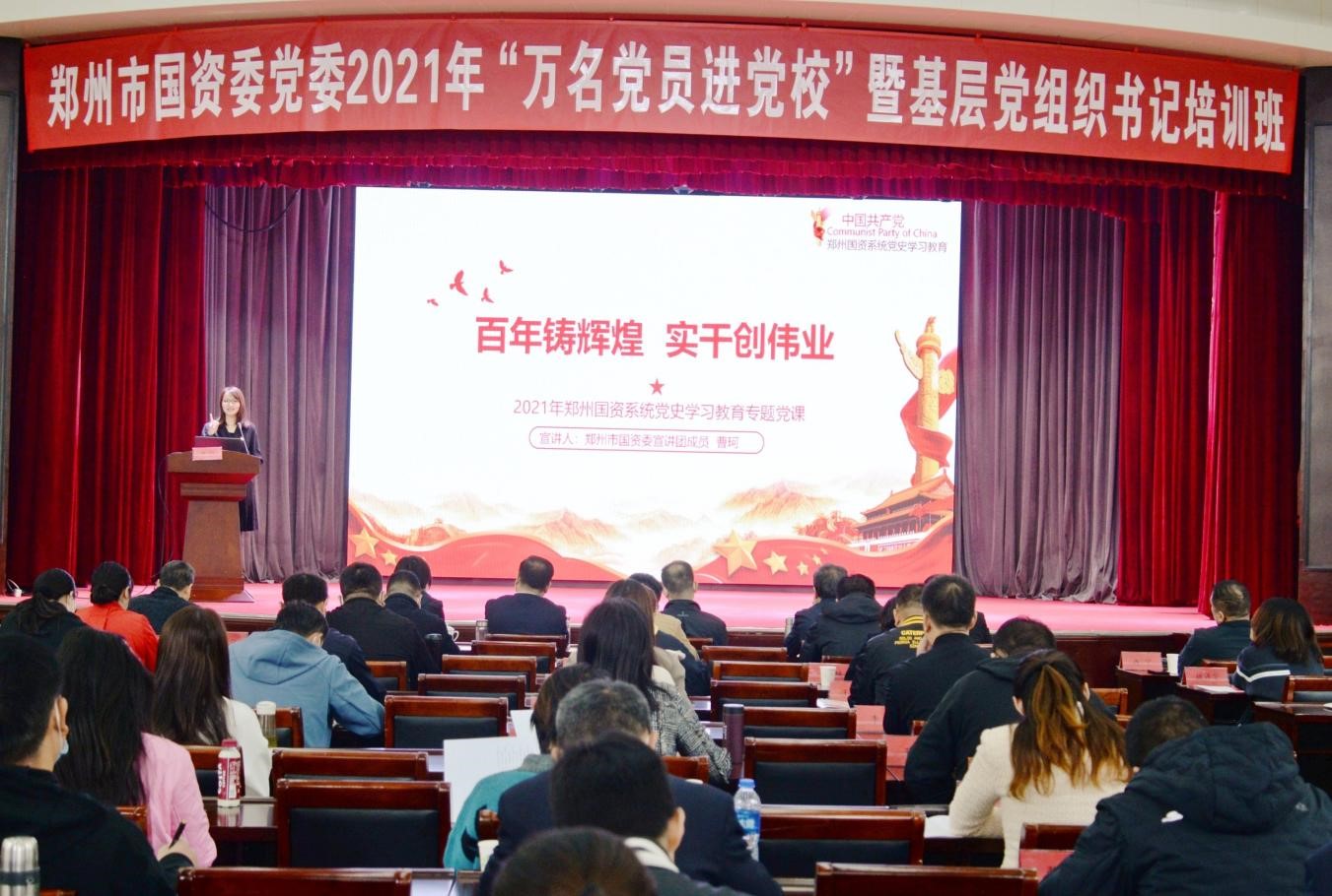 10月19日,鄭州市國資委黨委舉行2021年“萬名黨員進(jìn)黨校”暨基層黨組織書記培訓(xùn)活動,鄭州地產(chǎn)集團(tuán)西流湖公司黨支部曹珂同志作為市國資委宣講團(tuán)成員,向市國資委黨委市管企業(yè)優(yōu)秀黨支部書記、優(yōu)秀共產(chǎn)黨員130余人進(jìn)行了以《百年鑄輝煌 實干創(chuàng)偉業(yè)》為主題的黨課宣講。