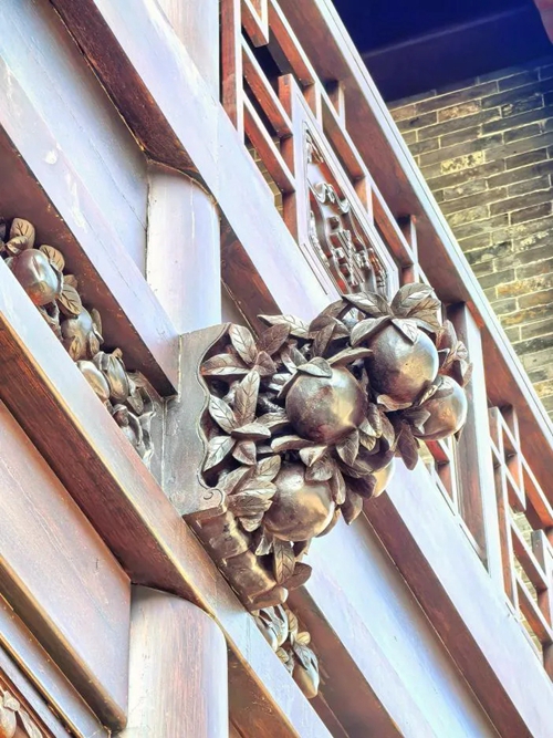 進(jìn)入北門(mén),首先映入眼簾的是16號(hào)樓,其主題為壽桃,主題來(lái)源于信陽(yáng)鄧穎超祖居,祖居繡樓內(nèi)部裝飾有壽桃石雕,我們便選取此圖案進(jìn)行創(chuàng)作,在16號(hào)樓的墀頭、雀替、卡子花處均有精美的壽桃紋樣。