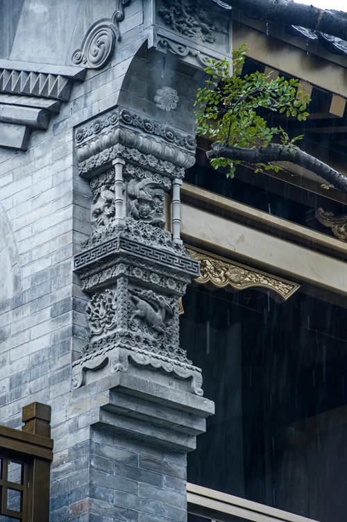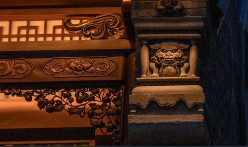 與之相對(duì)的17號(hào)樓主題為仙鶴,主題靈感來(lái)自于“仙鶴的故鄉(xiāng)”鶴壁。建筑上精美的墀頭也表達(dá)了此棟院子的主題,其上段位仙鶴,寓意松鶴延年,墀頭下端位仙鹿,寓意福祿綿長(zhǎng)。而這處雕刻精美又涵義豐富的墀頭設(shè)計(jì)來(lái)源于河南鶴壁的古城摘星臺(tái)公園。