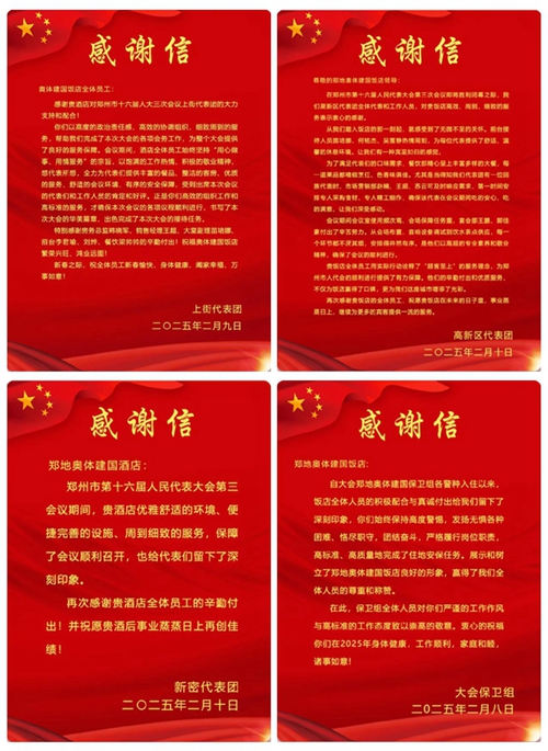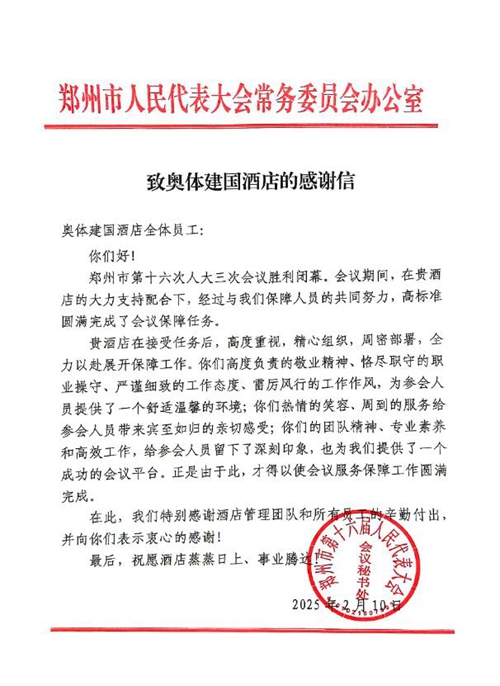 2025年2月10日,鄭州市第十六屆人民代表大會第三次會議第二次全體會議勝利閉幕。鄭州城市發(fā)展集團(tuán)旗下河南鄭地奧體建國飯店作為本次大會的駐地保障酒店,以“五星”服務(wù)標(biāo)準(zhǔn)(環(huán)境舒心、食宿貼心、細(xì)節(jié)暖心、保障安心、文化潤心),圓滿完成了各項接待任務(wù),贏得了與會代表和會務(wù)組的一致好評。
