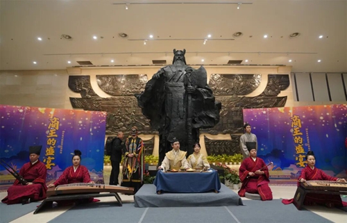當(dāng)晚,博物院不再是靜默的展廳,而化身為穿越時(shí)空的舞臺(tái)。以莊嚴(yán)的商湯雕像為背景,古器樂(lè)節(jié)目《商王的盛宴》奏響,悠揚(yáng)古樂(lè)聲中,商湯與民同宴、祈求順?biāo)斓臍v史場(chǎng)景再現(xiàn)眼前,令人恍若穿越三千年。